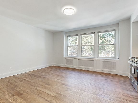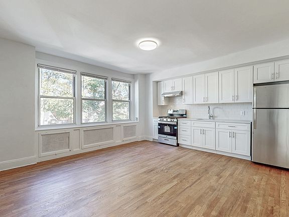 Step inside to discover a bright, open-concept living area bathed in natural light from three large windows overlooking a quiet, tree-lined street. The inviting layout features hardwood floors, freshly painted walls, and a brand-new kitchen with white shaker cabinets, sleek quartz countertops, subway tile backsplash, and stainless-steel appliances including a gas range, vented hood, and full-size refrigerator. The full renovated bathroom has a full size tub and new shower doors.
