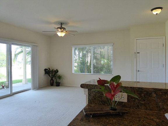 Enjoy expansive golf course, blue sky, and sunset views from this private ground floor condo located just off the 14th fairway on the Waikoloa Village Golf Course. Beautiful tropical landscaping adds color and privacy to this 2 bedroom, 2 bath condo. Upgraded quality throughout including granite counter tops in the kitchen and baths, ceramic tiled entry and hallways with carpet in the living rooms and bedrooms. Spacious nine foot ceilings with ceiling fans throughout.