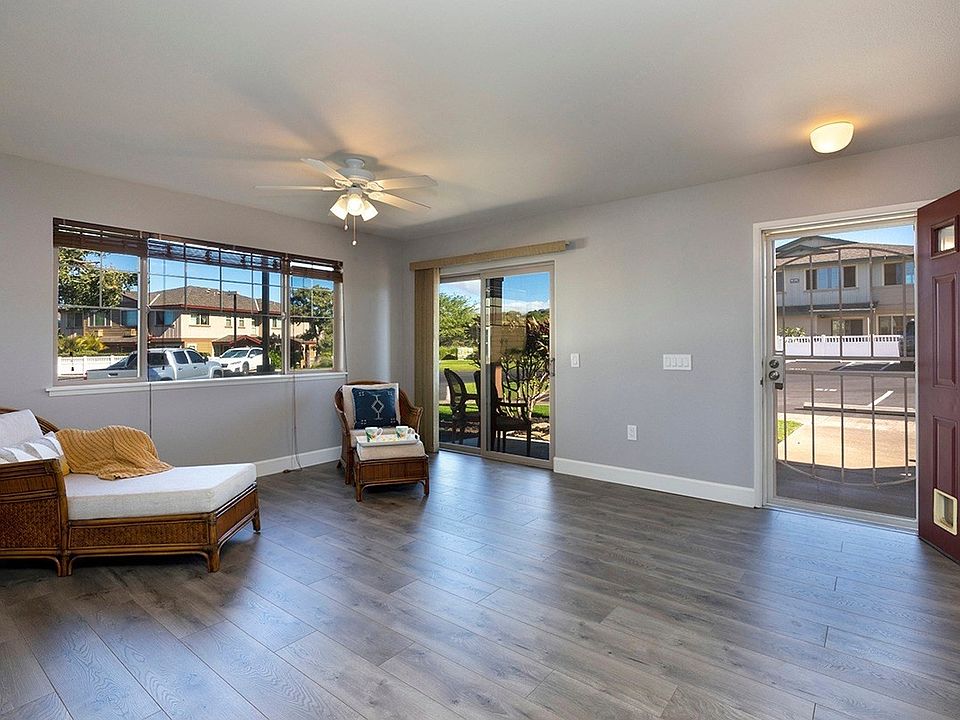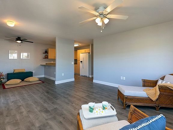 This Makana Kai at Wehilani ground floor, single level 2 bedroom/2 bath condominium in Waikoloa Village has just been refreshed and is move-in ready:- freshly painted in designer neutrals- new laminate wood plank flooring - new oven/stove, newish refrigerator, and new light fixture in kitchen.The condo has an open floor plan, making it seem spacious for its compact 825 sq ft. The kitchen opens to the dining room; put barstools at the counter if you want to use the dining room as an office or lounge. Plenty of light from the windows and the sliding door opening onto the front lanai. The lanai closet holds a stacking washer-dryer. Enjoy Mauna Kea views as you do your laundry! The condo comes with two deeded parking spaces.The master bedroom has an en-suite bathroom with tiled shower, and the second bedroom is directly across from the second full bath with its shower-tub combo.Waikoloa Village is home to the Highlands Shopping Center with groceries, banking, gas station and restaurants. Village amenities include a swimming pool, tennis courts and a golf course. The Kohala Coast beaches and the shopping and services of Waimea are each a short drive away.