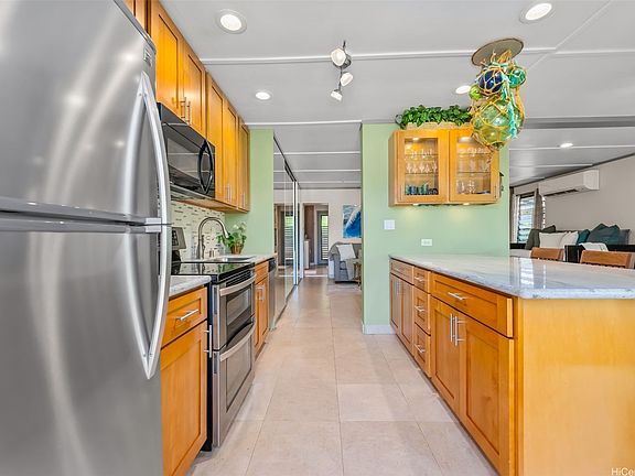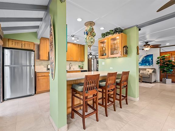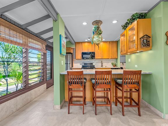 Welcome to the gated community of Mokule‘ia Beach Colony 5B, a spacious and quiet retreat on Oahu’s North Shore. This thoughtfully updated unit features a beautifully renovated kitchen with mostly new appliances, a complete electrical upgrade from top to bottom, and ceiling fans throughout. A brand new split AC system, plumbing upgrades, and in-unit washer/dryer add comfort and convenience, while travertine tile throughout creates a seamless, timeless flow. The open layout is bright and inviting, perfect for relaxing or entertaining. This bungalow was once the private escape of a well known local artist, who drew much of his inspiration from peaceful beach walks and the abundant marine life thriving nearby. Surrounded by lush tropical landscaping and natural light, it offers privacy with custom window treatments. Parking is conveniently located just outside your back entrance, with ample guest parking, and an outdoor shower makes rinsing off after the ocean easy. With direct swimming access to pristine waters and a sandy beach, plus being minutes from Haleiwa town, 5B blends modern comfort w/ authentic island living, offering the perfect full-time or weekend sanctuary. VA approved.