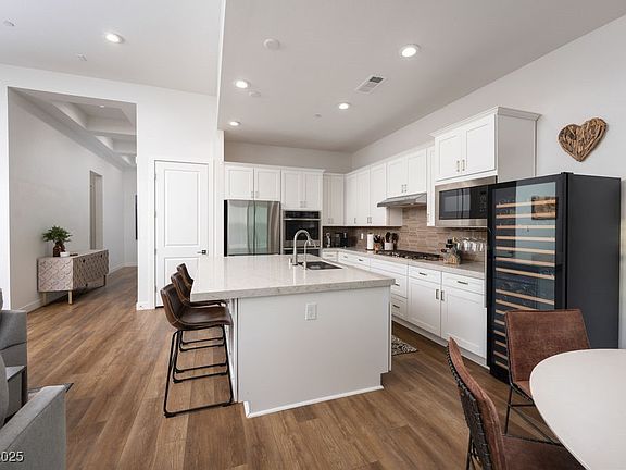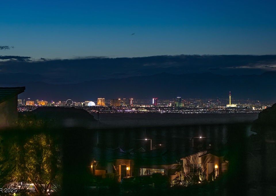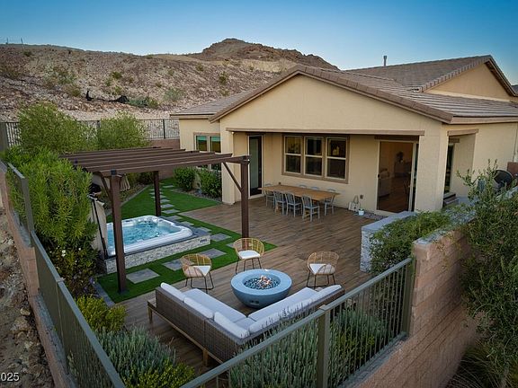 Situated on a ultra premium lot, this 3 bedroom 3 bath home offers stunning Las Vegas Strip VIEWS(inside & out). The interior showcases a highly upgraded gourmet kitchen w/oversized quartz island, designer bathrooms, finished w/ a custom fireplace & mantle. Open-concept layout features 12ft.ceilings in the main living area & tray ceilings. Primary suite includes nice views, French door to a private, villa-like backyard & a spa-style bath w/a walk-in shower, wall-to-wall tile & a beautiful arched accent wall . Secondary ensuite is ideal for guests, while the third bedroom—currently an office—features a custom glass enclosure.The private backyard is built for entertaining, w/a sunken jacuzzi, fire feature, covered patio, built-in BBQ, concrete table seating & seamless tile flooring. Spacious side yard & spectacular mountain, sunset, and Strip views complete the outdoor space. Located in Lake Las Vegas master-planned resort community, the home offers quick access to the Sports Club.