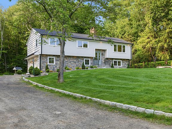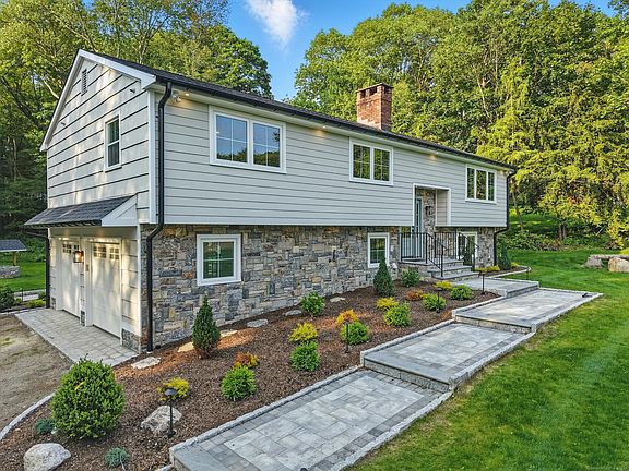 Welcome to your new home in Newtown, CT! This fully renovated 3-bedroom, 2-bath raised ranch offers a spacious open-concept layout with refinished hardwood floors and custom stonework. Nearly new construction, the home has been redone top to bottom with 2 brand-new kitchens, updated bathrooms, central air (up and down), spray foam insulation, new roof and gutters, new windows, new appliances (including washer/dryer and water softener), epoxy garage floors, and a Trex deck. Modern upgrades include security cameras, a Sonos music system, LED and landscape lighting, and a whole-house generator. The main level features a living room with a brick wood-burning fireplace, dining area, and custom kitchen. The primary suite includes a full bath, with two additional bedrooms nearby. The finished lower level is ideal for multi-generational living or flexible use, complete with a second kitchen, family room, full bathroom, laundry area, playroom, and a second fireplace. Set on 1 acre, the landscaped property includes a spacious deck, patio, built-in fire pit, and a 2-car garage. Conveniently located within walking distance of Rock Ridge Country Club and Ferris Acres Creamery, with top-rated schools and easy access to the Bethel train station for commuting.