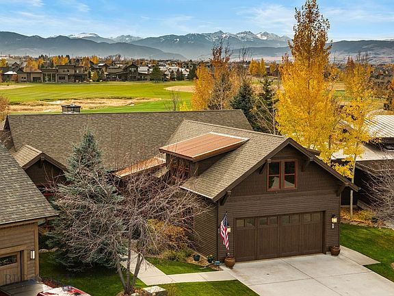 Experience breathtaking views across two fairways and out to the snow-capped Spanish Peaks from this timeless Locati-designed home in the exclusive Black Bull community. Designed for effortless main-level living, the home showcases an open, light-filled layout with classic Montana finishes and exceptional craftsmanship throughout. The great room features a grand stone fireplace and an adjacent wine bar with beverage fridge—perfect for entertaining. From the living or dining areas, step out to the covered redwood deck, where a wood-burning stone fireplace and built-in gas grill create an inviting space to enjoy the expansive golf course and mountain vistas year-round. The chef’s kitchen offers a massive island, walk-in pantry, and upgraded appliances. Each of the three main-level bedrooms includes a private attached bathroom, high ceilings, custom closets and ample space. Upstairs, the spacious 500 sq ft+ bonus room provides flexibility for an office, den, guest space or media room. Additional features include freshly stained cedar siding, wood beam accents, whole house humidifier, water softener with RO system, leaf-filtered gutters, and a heated epoxy-floored garage with extra storage. Set on a quiet cul-de-sac just moments from the Black Bull Club amenities, this residence combines classic design, modern comfort, and unmatched views for the ultimate Montana lifestyle. The Black Bull community offers a championship golf course, pool, fitness center, private restaurant, walking trails, and groomed cross-country ski trails. Please inquire for current club information. Some photos depict club amenities.