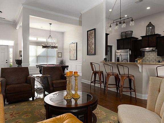 - RoomKitchenFeatures: Granite Counters, Pantry, Floors-Hardwood, Cabinets-Stained, Bar