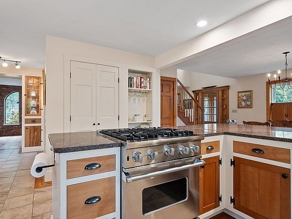 Welcome home! Well maintained, 3 bedroom, 2 bath Saltbox Colonial in convenient location. Lots of unique/custom built ins throughout this builders home. Main floor has a large kitchen with granite counters & tile floor which is open the dining area. Granite counters, tile backsplash and a natural gas Viking gas range and peninsula complete the kitchen. Woodburning stove in the living room with brick accent wall will warm the home on the chilly nights. The adjacent, heated sunroom is great space for a reading nook or home office. Cozy family room wired w/surround sound speakers! 2nd floor master is comprised of 2 rooms! How would you use the 2nd room? Office, dressing room? 2 add'l bedrooms with hardwood floors..one with built in cabinet. Full bath with jetted tub and separate shower. Laundry room in the basement is also wired for surround sound. Basement has plenty of storage space. 2 decks. Luscious gardens. 4 bedroom septic!! Energy efficient 2x6 construction.