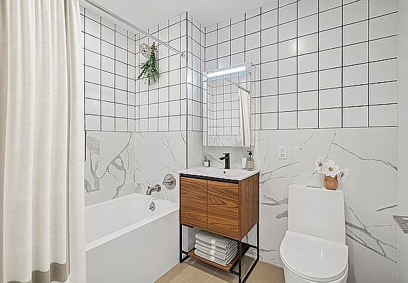 Boasting chic finishes and private outdoor space, this brand new 1-bedroom, 1-bathroom home offers a luxury rental experience in a tranquil residential enclave of one of Brooklyn's trendiest neighborhoods. The apartment is a portrait of contemporary comfort and urban design. Beautiful wide plank floors complement airy ceilings and oversized windows with elegant grilles, stunning river and city views, and Northwest exposure. The private balcony is ideal for sun lounging, enjoying morning and evening drinks, urban gardening, and more. A welcoming foyer with a coat closet flows into an open-concept living, dining, and kitchen space saturated with natural light. The corner kitchen features lovely fixtures and ample storage. It is equipped with sleek stone countertops, a white subway tile backsplash, American walnut cabinets, and high-end stainless steel appliances. The bedroom has a wall of reach-in closets, and the bathroom has gorgeous Calcutta marble and white tile walls, a custom vanity, and a deep soaking tub. An in-unit washer/dryer completes the home. Casa Dumbo is a brand new luxury rental building offering condominium-style lifestyle amenities and modern interiors. A classic redbrick facade with factory windows and metal accents captures the character and charm of the area's industrial past. Residents of Casa Dumbo enjoy over 15,000 sq. ft. of pristine amenity spaces. Included are an inviting lounge, dedicated co-working areas, a state-of-the-art fitness center, a welcoming lobby with a virtual doorman system, a tranquil courtyard with lush landscaping and lounge chairs, car, bicycle, and stroller parking, a package room, and an expansive rooftop deck with grilling stations, dining and lounge furniture, and enchanting river and skyline views. Casa Dumbo sits on a quiet residential street in Vinegar Hill. The building is moments from trendy restaurants, cute cafes, and lively bars, and it is close to Main Street Park, the DUMBO waterfront, Time Out Market, Jane's Carousel, and Commodore Barry Park. Downtown Brooklyn, Brooklyn Heights, and Brooklyn Navy Yard are also close by. Public transportation options include the A/C/F subway lines and the NYC Ferry. Pets are welcome.