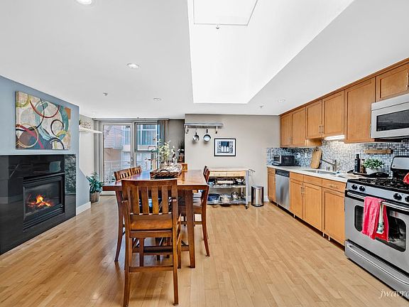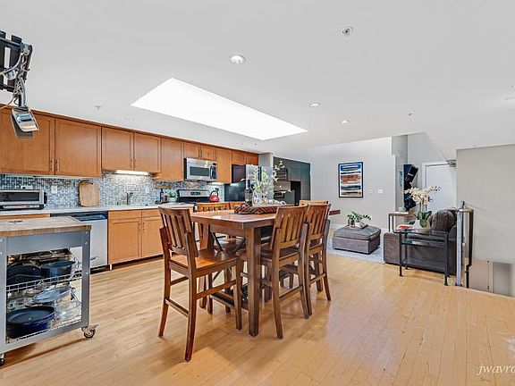 Gourmet kitchenHuge skylightsHardwood and cork floorsStainless steel appliancesGlass tile back splashCustom cabinets