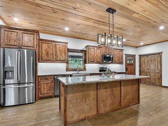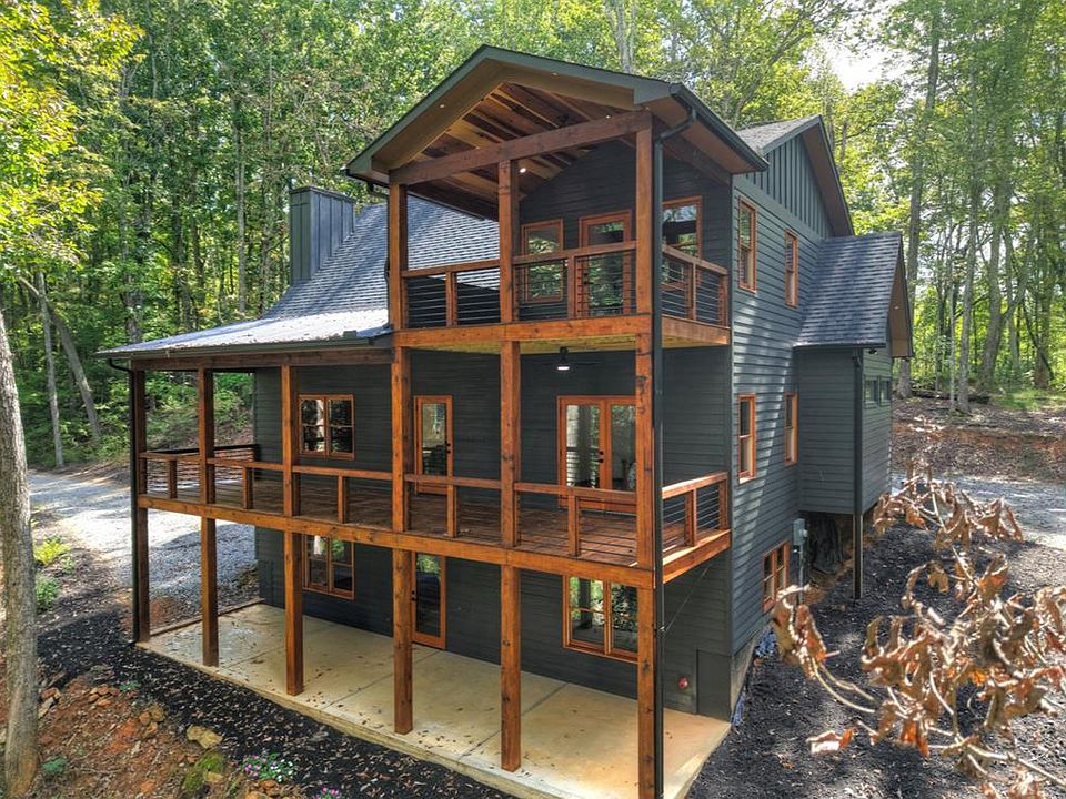Welcome to 68 Hibiscus Lane! This stunning 4-bedroom, 3-bath home is just minutes from downtown Blue Ridge . Offering the perfect blend of convenience and privacy. The main level features a spacious open kitchen with granite countertops, a large island with seating, tile backsplash, stainless steel appliances, farmhouse sink, and abundant cabinet storage. A separate dining area overlooks the wooded setting, while the vaulted living room showcases a soaring stone fireplace, exposed beams, and a mix of sheetrock and wood finishes for a warm mountain-modern feel. The primary suite on the main includes a beautifully tiled shower, double vanity, large walk-in closet. Upstairs you'll find two additional bedrooms and a full bath, with one bedroom featuring its own private covered porch. An open staircase with wide wooden treads ties the levels together. The terrace level offers a large entertainment space with a modern electric fireplace, a fourth bedroom with walk-in closet, and an additional flex room ideal for a bunk room, office, or workout area. Outdoor living is made easy with two levels of covered porches, perfect for entertaining or relaxing among the trees. The exterior combines Hardie siding and stone for durability and low maintenance, with paved access nearby and a gravel drive. Located 5- 10 minutes from the shops, dining, and outdoor recreation of Blue Ridge, this home blends rustic character with modern comforts in one of North Georgia's most desirable locations.