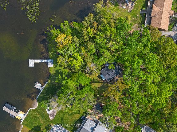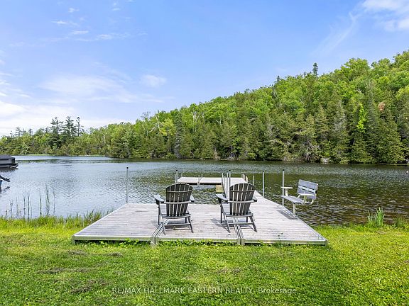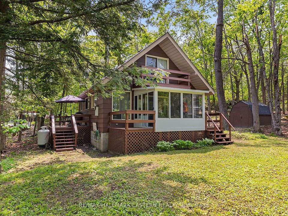 Welcome to your lakeside retreat on Big Bald Lake, part of the desirable Trent-Severn Waterway with access to five lakes without locking. This well-maintained, four season chalet-style cottage offers 150 ft of private shoreline on a beautifully treed lot with level terrain at the water's edge. Featuring 3 bedrooms, a full 4-piece bath, and an open-concept kitchen, dining, and living area with hardwood accents and a cozy propane fireplace. Enjoy peaceful views from the glass sunroom or step outside to the spacious deck and dock for outdoor living. The upper lakeside bedroom includes a walkout balcony for serene morning coffee moments. Recent updates include a new water pump and UV system (2024) and a newly re-shingled roof (2024). Across the lake, 283 acres of privately owned managed forest create a tranquil, undeveloped view. A nearby jumping rock adds fun for the adventurous, and you're just minutes from stunning turquoise waters of Sandy Lake Beach - perfect for swimming and paddling. This turn-key property is being sold fully furnished with all contents included.
