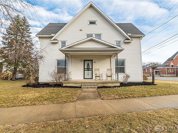 Nestled in the charming town of Osgood, this beautifully updated two-story home offers the perfect blend of comfort and timeless character. Boasting a spacious layout, this home features an inviting design with abundant natural light, high ceilings, and elegant finishes throughout. The gourmet kitchen is a chef’s dream, complete with stainless steel appliances, updated cabinetry, accent stone wall, and plenty of room for your dining table & chairs. Relax after a long day in the spacious living room with beautifully painted wooden ceiling adding architectural interest and a touch of timeless elegance to the home. The living room also features a fireplace as a focal point creating a cozy and inviting atmosphere. The family room (or potential dining room) has that extra space so that your family can spread out. Upstairs, the expansive bedrooms provide ample space and comfort, while the spacious main bedroom features an abundance of natural light, and the closet has a barn door that adds a perfect blend of rustic charm and modern functionality to any space. The home’s character shines through with unique architectural details, stylish fixtures, and cozy nooks that add warmth and charm. The basement adds lots of storage room and many updates such as new water softener, new water heater, new well pressure tank and pump. Some additional updates include new HVAC, new flooring, added second full bath and updated other full bath, new lighting, new back door, and more! Outside, enjoy a large corner lot yard with plenty of room to build any size garage you may need. The backyard is perfect for relaxing or entertaining, along with a welcoming front porch that captures the essence of small-town living. With its prime location near quaint shops, local eateries, and scenic parks, this home is a rare find—offering updates while preserving the historic charm that makes it truly special.