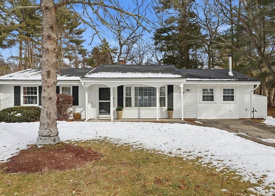 Move-in ready charming ranch with a new heating and central air system installed, offering easy one-level living in a desirable neighborhood close to schools, ball fields, shopping, and highways. The large kitchen features a butcher-block island with seating and a newly installed dishwasher. The kitchen flows directly into a versatile bonus room with a wood stove and a built-in bar/pantry—ideal for a dining area, den, home office, or family room—with sliders to the patio. Three good-sized bedrooms offer ample closet space. Additional updates include a freshly painted interior, newer carpets and flooring, a separate laundry/storage room, a newer oil tank, and an enlarged storage shed. Step outside to a patio and a large, private wooded backyard—perfect for relaxing, entertaining, or cozy nights by the fire pit. Town water/sewer. A great opportunity for easy, low-maintenance living in a fantastic neighborhood.