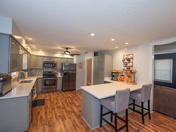Sleek quartz countertopsDetached garageModern kitchenSpacious layoutFenced backyard
