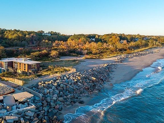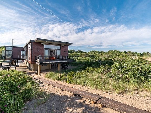 Northern California coast meets Boston's Gold Coast in this iconic, 4-bedroom, 3-bath direct waterfront Mid-century Modern house in Prides Crossing. Designed by famous architect John Lawrence Jr. as a weekend retreat, this home enjoys an unparalleled level of privacy and panoramic, 180-degree vistas of Manchester-by-the-Sea, Marblehead, Salem Sound to Misery and beyond. Sited on 2+ acres abutting RockMarge Estate to the west and 18 acres of conservation land to the east, the elevated living space is framed by seagrass covered dunes at the very end of a secluded, winding road lined with lush vegetation. Ideal for entertaining or intimate gatherings, this property is a slice of heaven. Looking to create something completely new? This offering includes city approvals and plans in hand to build a new 4,600+ sq. ft. primary residence and preserve 1,300 sq. ft. of existing home as a beach cabana.