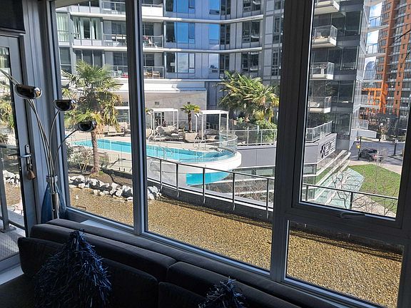 Immerse yourself in modern luxury with this furnished one-bedroom condo in Vancouver, offering 585 square feet of meticulously designed space. Perfect for those who appreciate contemporary elegance, this property serves as a stylish urban retreat. The condo features high ceilings and an open concept layout, creating a spacious environment that is both inviting and functional. The kitchen is a chef's dream, equipped with stainless steel appliances and marble countertops, making meal preparation a pleasure. Air conditioning ensures a comfortable atmosphere throughout the year, while in-suite laundry adds convenience to your daily routine.