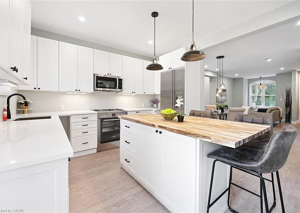 Welcome to your dream home at 68 Spruce St, nestled in heart of historic Galt & just a short stroll from the scenic Grand River! This completely gutted (with only the original exterior brick remaining) & fully renovated gem offers the best of both worlds-timeless charm & modern comfort W/brand-new plumbing, electrical, high-efficiency windows & HVAC systems for peace of mind for yrs to come. Step into sunlit open-concept living & dining area bathed in natural light from stunning arched picture window. Scratch-resistant vinyl plank flooring ties the space together while 30 stylish pot lighting throughout enhances every room & creates a bright welcoming atmosphere-perfect for relaxing W/family or hosting friends. Showstopper kitchen W/white cabinetry, quartz counters & centre island topped W/warm butcher block complete W/pendant lighting & overhang seating for casual dining. Step out directly to the backyard from the kitchen creating ideal indoor-outdoor flow. Elegant oak staircase leads upstairs to 3 spacious bdrms including generous primary suite W/dual windows. Upper-level 4pc bath is finished W/porcelain tile floors, sleek vanity & tiled tub/shower combo. Downstairs the partially finished bsmt expands your living space W/finished 3pc bath, heated marble floors & dedicated laundry room. Bright rec room is fully drywalled & painted left without flooring so new owners can customize it to suit their needs. Wet bar R/I for kitchenette is already in place. This level is ideal for future in-law suite or mortgage helper setup. Located in sought-after Galt neighbourhood, enjoy the convenience of being steps to Soper Park with its trails, splash pad & disc golf. Walking distance to downtown boutiques, dining, cafés & historic Cambridge Farmers Market. This is more than a home, its a lifestyle! Move in & enjoy new everything in one of Cambridge's most charming & connected communities. *Finished bsmt image is a rendering, illustrating potential with flooring & kitchenette*