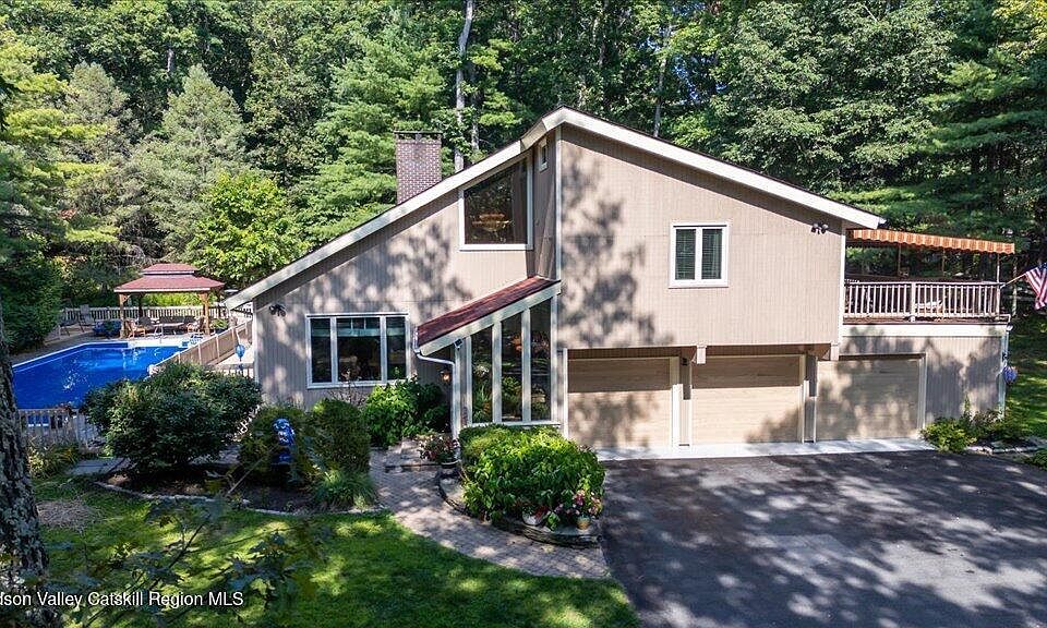 STRESS FREE! Live stress free for the first year, With home purchase, seller will include a new electric vehicle up to 50000 value and include12 months of property maintenance including lawn care, snow removal, pool opening/closing, home warranty, and heating oil for a combined value of up to 25000 value. No worries for the first 12 months making this home perfect for weekend retreats or a full time residence .Welcome to 68 Tall Oaks. Home is situated back off the road in one of the areas most desired neighborhoods. For those with a refined palate that won't settle for anything but the very best, enter the gates of the fenced property to discover this magnificent estate sprawled across a generous 1.7 acres private lot. Thoughtfully designed layout with a primary 1st floor bedroom equipped with large closet and ensuite bathroom. This bedroom also as outdoor access via sliding glass doors to a koi pond patio with hot tub. Explore 2 open living areas large guess bathroom and formal dining area with double sided fireplace providing ample space for entertaining or for everyday living. The kitchen features Corian countertops and island equipped with modern amenities and an abundance of cabinet space. Off the kitchen is a large laundry room with granite countertop, sink and cabinet for more counter space. Upstairs you will find 2 bedrooms each with a large loft space and access to a large outdoor deck covered with an awning for protection from weather. A few steps up from the 2nd floor boasts a 4th loft bedroom and office space. A partially finished basement with half bath and exercise room. A burnham boiler, new roth oil tank, and new water heater complete the basement mechanical room. Outside you will enjoy 1.7 acres of fenced peace and tranquility to create new memories on the expansive decks and stone patios that surround the home and the oversize 20x60 heated, saltwater swimming pool. For the automobile enthusiast or someone with a lot of toys, there is an attached 3 car garage plus a detached 2 car garage with it's own 100 amp electric service with 2 Level 2 EV chargers. This estate really shows pride in ownership with high end upgrades and up to date maintenance. Located just minutes from NYS Thruway, Rhinecliff bridge and Kingston's very popular uptown stockade district.