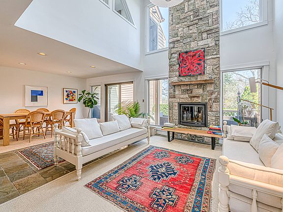 Enjoy waterfront living in historic Sag Harbor Village. This duplex condominium in The Villas features open first floor living areas - a double height living room with two-story stone fireplace, dining room with stone flooring, eat-in kitchen with island seating and stainless steel appliances, and a powder room. Sliding glass doors open to a large private terrace. A washer and dryer are also on the first floor. The bedrooms are upstairs and include the primary suite which features a bath with frameless glass-enclosed shower and pedestal sink. There is an upper terrace off the primary bedroom. The additional bedroom uses the second full bath with a tub/shower and pedestal sink. A bright and spacious home office / sleeping loft is also on this level. Community amenities include two tennis courts and a heated gunite pool with spacious patio. There's also a private community beach where kayaks and paddle boards can be launched. Best of all, you're just blocks to the many delights of this historic village, and don't need a car to get there.*Early access with June date possible.