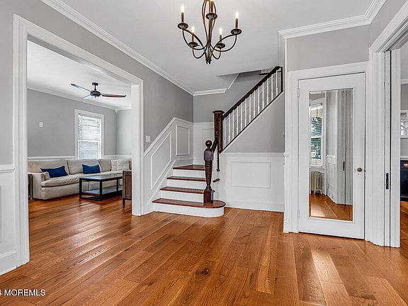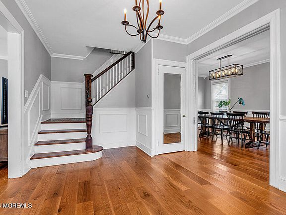 Shore colonial with a cozy front porch ready for relaxation. Enter the spacious foyer with wood staircase and gorgeous moldings! The foyer opens to living room and large dining room. Beautiful newer kitchen with granite counters, custom tile backsplash, decorative moldings and hardwood floors throughout. Bonus room upstairs is currently being used as a walk-in closet/laundry but can easily be made to be used as a fourth bedroom. Full walk-up attic perfect for storage or future finished living space. Large fenced yard on oversized lot. New Boiler and Water Heater recently installed. Located just 2 miles to beaches, Pier Village, Monmouth Park Race Track, shopping & restaurants! Minutes to highways, train & NYC ferry and upcoming Netflix Studio.