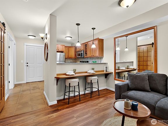 Tucked into a quiet corner of Cypress Place, this ground-floor studio lives more like a one-bedroom. A barn-style sliding door separates the sleeping area, complete with a custom closet system and storage. Built-in shelving plus a swiveling TV platform let you enjoy entertainment from bed or sofa, while the kitchen opens to a built-in eating space that maximizes function. In-unit washer & dryer add everyday ease, and the living area extends to a private patio wrapped in greenery. Step out your own private door and it won’t feel like condo living. With reserved parking, bike storage, and a fitness room, this home is an excellent fit for anyone seeking smart design and low-maintenance living.