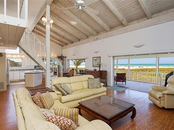 Located in the most magical setting on white sands of world famed Siesta Key beach, this one of a kind Gulf front property is poised prominently on the first lot adjacent to the #1 beach in the US! It doesn't get any better than this...an income producer, you can rent this home till your heart's content or just live the dream as it is. Alternatively, build your dream beach house and settle in for the best sunsets and family retreats you can imagine. Walk directly out to the water, pull your kayaks and paddle boards westward and know that you have landed the best spot ever. The rustic charm creates a comfortable and casual ambience in the home with wide open spaces and banks of windows and huge sliding glass doors for uninterrupted panoramic views of the Gulf of Mexico. The master suite and an additional bedroom are located on the first living level, then the loft accommodates the kids. Heart Pine floors, volume tongue-n-groove ceilings, waterside dining room and a white on white open kitchen. Baths are nicely updated. Lower level provides 4 car parking and additional storage and just a great place to hang out under the covered porch. A short stroll to Siesta Key Village and all the restaurants, grocery, retail and night life. You only live once!