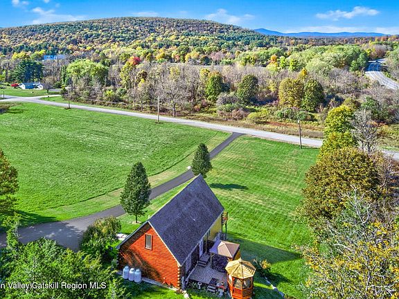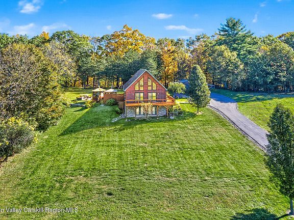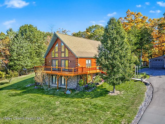 Set high on a private 2.7-acre lot, this beautiful log-sided chalet offers stunning natural light and peaceful country living just minutes from the heart of Coxsackie. The open-concept living room features a cozy fireplace with a pellet insert and a dramatic wall of windows and sliding doors that bring the outdoors in and frame the surrounding views. A well-appointed kitchen and separate dining room make entertaining easy and enjoyable.