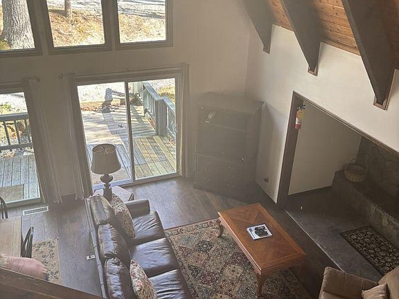 A beautiful, fully furnished 2/2 cabin perfectly positioned in the Chalet Village Community with a breathtaking 180-degree mountain view for your relaxation and enjoyment when you come home. This property includes unique features for your comfort. There are eight steps to the entryway and a beautiful mountain view from the front deck. Rocking chairs are on the front deck for enjoying one of the best views in the community. A large rock, wood-burning fireplace with a kitchen that opens to the living and dining area. A large master bedroom is on the main level, and a spacious loft bedroom with a full bath is upstairs. From this property, it is just a short walk to the Chalet Village Community trout pond and private pool for the residents. The monthly rental rate covers water, general grounds, sewer, and HOA fees. The resident is responsible for electricity and internet. This cabin is located in an HOA community that maintains regulations for your safety and enjoyment of the beautiful homes and views. The house is fully furnished with the exception of bed linens. This home is pet friendly with certain restrictions and a pet deposit. Just minutes to downtown Clayton, Dillard, and twenty minutes to Highlands and Franklin, NC.