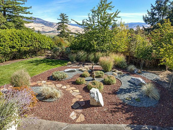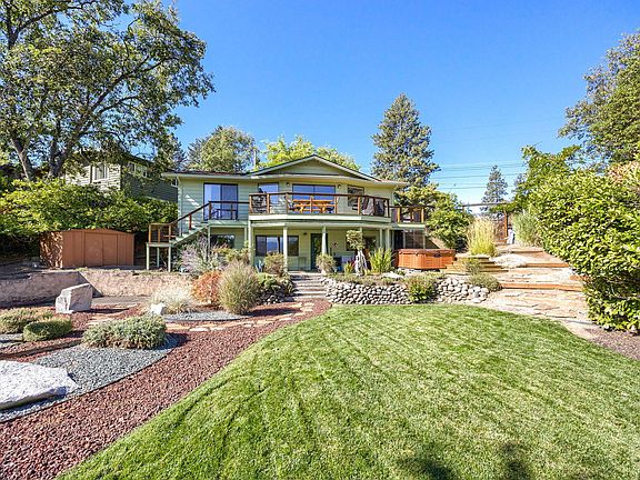 Delightful surprises await when you step inside this dramatic and light-filled home. Perched above the Boulevard, the house offers exquisite views of the valley from the living area and primary bedroom. Then, the expansive deck overlooks a breathtaking yard with a Zen Garden, thoughtfully planted fruit trees, seasonal flowers, and a relaxing hot tub. Recently updated, the entire home is carpet-free and features on-trend LVP flooring for a contemporary look and ease of care. New additions include a gas range, washer and dryer, and bamboo lighting fixtures in the kitchen. The open floor plan lends itself to entertaining, with the living room enjoying glass doors that open to the deck. A dining room and bonus office space round out the main level. Downstairs are two more bedrooms, a full bathroom, and a family room that could be used as a media room, home office or an in-law set-up. It can be accessed through interior stairs or its own entrance—a truly wonderful oasis.