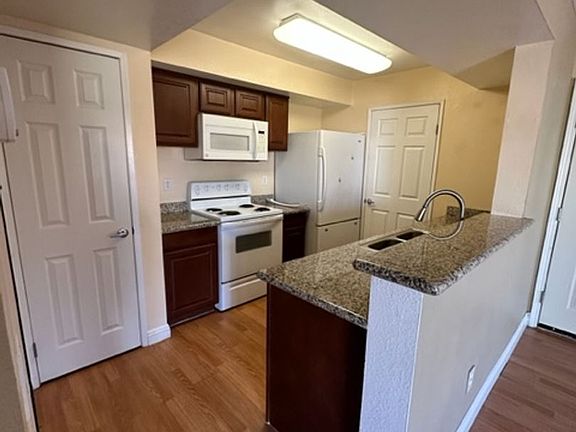 Charming 1st-floor 1-bedroom condo located in a gated community! This home features engineered wood flooring throughout with tile in the bathroom. The kitchen and bathroom both offer granite countertops, a breakfast bar, and all appliances included. Ceiling fans in the living room and bedroom, plus a wall-mounted TV bracket in the bedroom for convenience. Spacious walk-in closet and in-unit washer/dryer. Patio slider opens to a private covered patio. Community amenities include a sparkling pool.
