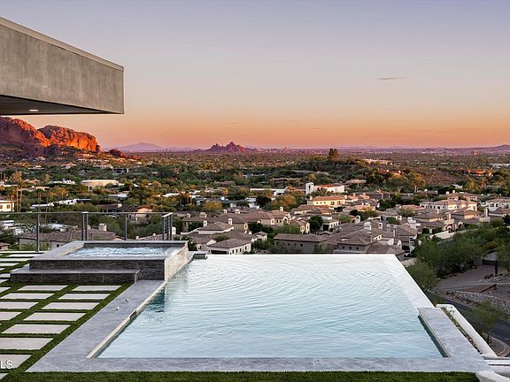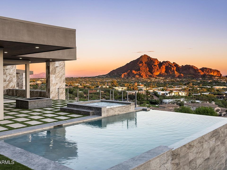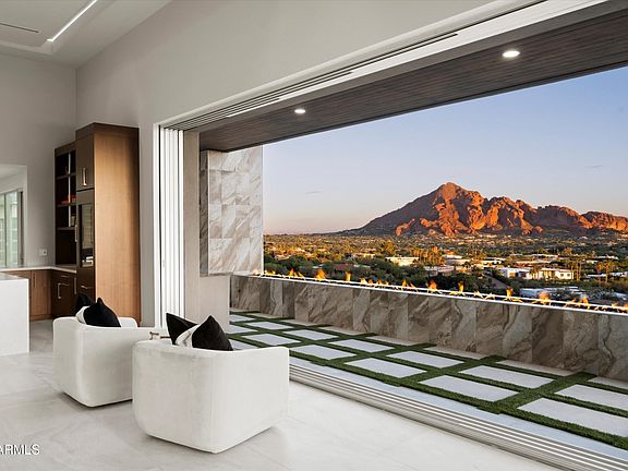 Welcome to a true hillside masterpiece in the exclusive 24/7 guard-gated enclave of Paradise Reserve. Newly built through a meticulous four-year process—from raw mountain terrain to a fully realized architectural triumph. This home sits on the best lot in the community, offering sweeping, unobstructed 180-degree views of Camelback Mountain, the Tempe Buttes, and the sparkling city lights of downtown, visible from nearly every room. Arrive via a private, beautifully designed driveway and be greeted by an impressive cooling/heating controlled 5-car garage, complete with a versatile flex space perfect for a home theater, gym, or studio. Step through a dramatic 10-foot glass entry door into a soaring double-height foyer, framed by expansive Fleetwood windows that maximize natural light and showcase the breathtaking views from the moment you enter. The gourmet kitchen is a chef's dream, featuring wrap-around custom cabinetry, a massive 16-foot island, a walk-in pantry, and a spacious eat-in peninsula with ample seating. The adjacent great room offers a floor-to-ceiling gas fireplace, a stylish bar area, and an entire wall of collapsible glass doors that seamlessly blend indoor and outdoor living.