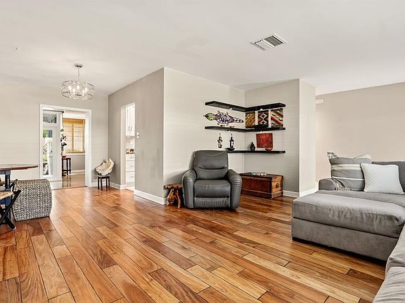 Stunning Contemporary home in 55+ Community of Mainlands featuring 2 beds + BONUS room, 2 baths, 1 car garage, almost 1700 sq ft A/C, NEW Roof (2024), Impact windows & doors. Nestled on a corner lot, this immaculate home offers a large screened patio overlooking a private garden oasis. HUGH bonus rm that can be used as a family rm + 3rd bedroom. Enjoy Plantation shutters, white porcelain tile, real wood flooring, white wood kitchen w/ extended cabinetry, Stainless Steel appliances & granite. Spacious primary suite w/ modern bathroom, walk-in closet & designer carpet. Perfect full time home or vacation getaway all w/ a low HOA fee ($105 mo. inc. clubhouse, pool, painting (every 5 yrs), pressure cleaning (every 2 yrs.), landscaping & sprinklers). Close to shopping, highways, beaches & more.