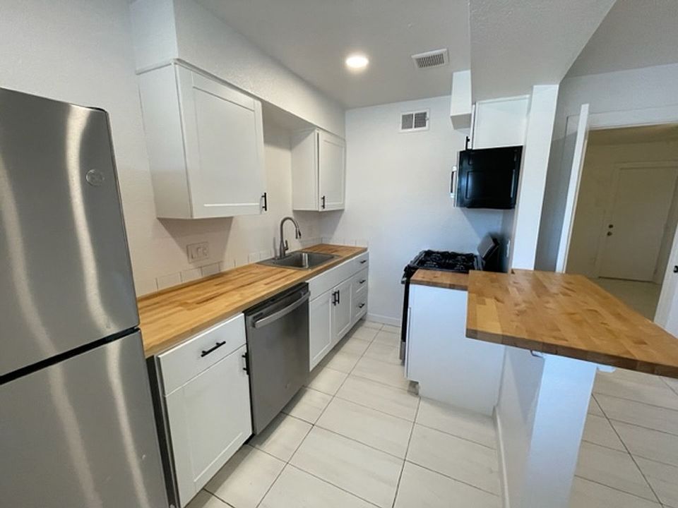 Dual pane windowsWhite modern cabinetsBreakfast bar seatingLed lightingAmple closet in bedroomWood butcherblock countertopsGas range