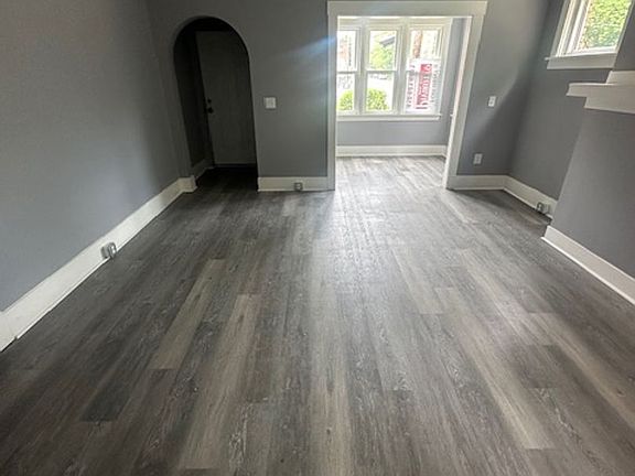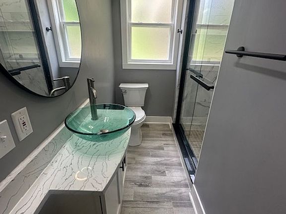 Stylish gray vinyl flooringNatural lightLarge windowsUpdated bathroomGlass-enclosed showerBrand-new kitchenStainless steel appliances