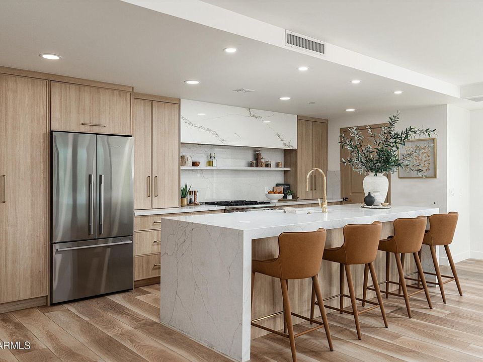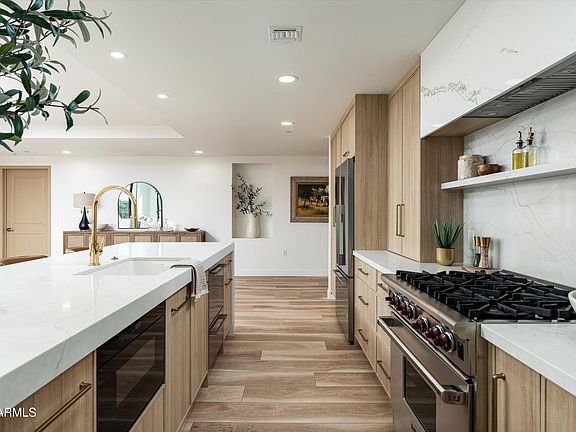 Welcome to The Mark, the ultimate blend of luxury, convenience & style in the heart of Old Town. This 5th floor rare 3-bed, 3.5 bath corner residence has been fully remodeled with no detail overlooked, this carefully curated transformation includes only the finest finishes. Walls of glass open to a dramatic oversized terrace, showcasing sexy Camelback Mountain views by day and glittering city lights at night, a stunning backdrop for both entertaining and quiet evenings. Inside, the home exudes sophistication with a chef's kitchen featuring custom cabinetry, dual Asko dishwashers, and a full pantry. Each bedroom is en-suite, and the primary retreat is enhanced by dual custom closets, including a hidden walk-in and wood built-ins. Life at The Mark feels like big city living with the best of Scottsdale. Amenities include a newly remodeled rooftop pool, spa, and ramada with panoramic views, a state-of-the-art workout room, sleek conference space, and lobby coffee bar, all supported by doorman concierge service. Residents also enjoy exclusive perks at the iconic Hotel Valley Ho, from discounts to in-room dining.