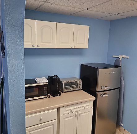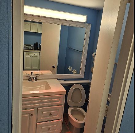 2nd floor+elevator, efficiency unit, 1 bathroom, AC, flat screen TV, 1 king bed and pullout sofa. Sheets and linens provided.