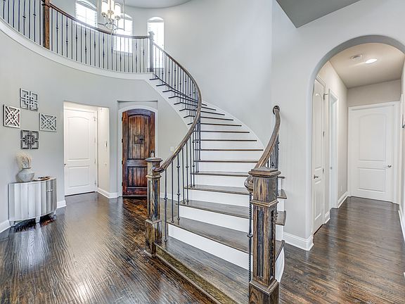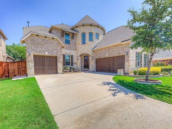 Gorgeous one owner CalAtlantic home in the prestigious Stone Hollow community, located within highly acclaimed Frisco ISD! From the moment you enter, you are greeted by a grand entryway with soaring ceilings, rich hand scraped hardwood floors, and a winding staircase with iron balusters. A French doored study and formal dining room create a welcoming and elegant first impression. The bright white gourmet kitchen is a showpiece, featuring an oversized island, granite countertops, designer backsplash, stainless steel appliances, gas cooktop, breakfast bar with glass front cabinetry, and a walk-in pantry. The open living area is spacious and inviting, highlighted by a stunning floor-to-ceiling stone fireplace and a wall of windows overlooking the backyard. The private primary suite offers a serene retreat with a sitting area and a curved wall of windows. The luxurious spa-like bath includes dual vanities with marble countertops, a soaking tub, glass enclosed shower, and his and hers walk-in closets. A private guest suite on the main floor adds convenience and flexibility. Upstairs, you’ll find an oversized game or flex room, a modern media room, and secondary bedrooms connected by a stylish Jack and Jill bath. Outside, enjoy an extended stone paver patio and a beautifully maintained backyard perfect for entertaining. A spacious three car garage completes this exceptional home.