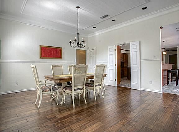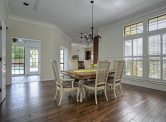 Great entertaining home that surrounds the pool; backs the Trinity, offers immediate access to trails; approx .75 acre; built-in TV projection; motorized movie screen in family room & privately lit basketball goal off rear garage! Split bedrooms. 4th bdrm upstairs w- private bath & balcony. Updated kitchen w- Termador Stainless Appliances; 5 burner gas cooktop. Understated from curb. Open, casual layout. Huge dog run on side of home. Dont miss!