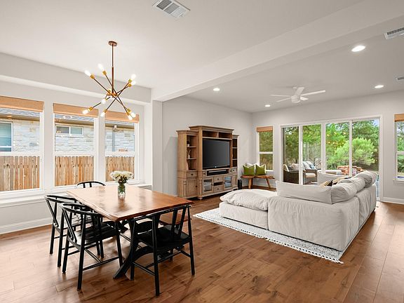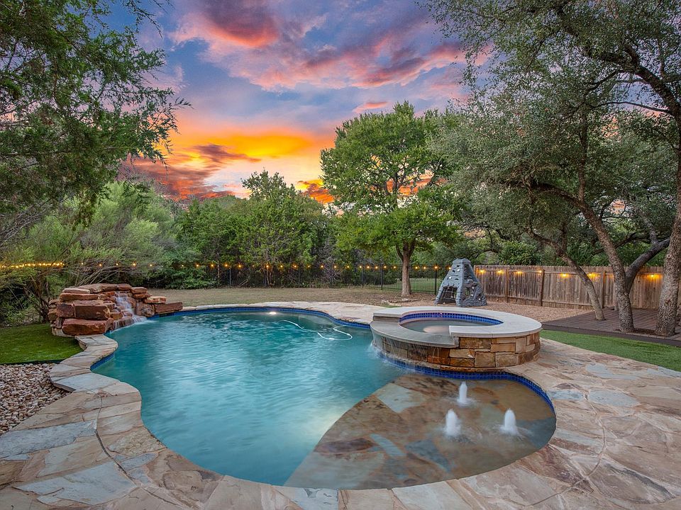 Nestled on a lovely street in Avana at Circle C, this home offers timeless design, privacy, and over $200K in upgrades—including $120K+ in the backyard. The 2,929 sq. ft. layout features open living with a chef’s kitchen boasting granite counters, island and breakfast bar, stainless steel appliances, gas cooktop, double ovens, and a seamless flow into the dining and living areas. Wood floors, soaring cabinets, custom shades, and a 3-car garage with built-in storage elevate the home. The serene primary suite includes an oversized walk-in shower, extended dual vanity, and large walk-in closet. A downstairs guest room with Murphy bed doubles as an office, while upstairs offers a loft/game room, media room, three bedrooms, a cleverly designed bath with separate vanity/shower areas, an additional half bath, and a wet bar opening to a second-level balcony. The backyard is a true retreat with a pool, hot tub, covered patio, artificial turf, play area, putting green, and mature trees for shade. A builder-enclosed greenbelt easement—exclusive to a handful of homes and not in tax records—enhances privacy, along with single-story neighbors. Walk to a top-rated elementary and community pool, with bus access to top middle and high schools. Enjoy Circle C amenities, Grey Rock Golf Course, HEB, dining, coffee shops, and miles of trails. Ideally located between Downtown Austin and Dripping Springs, under 20 minutes to ABIA!