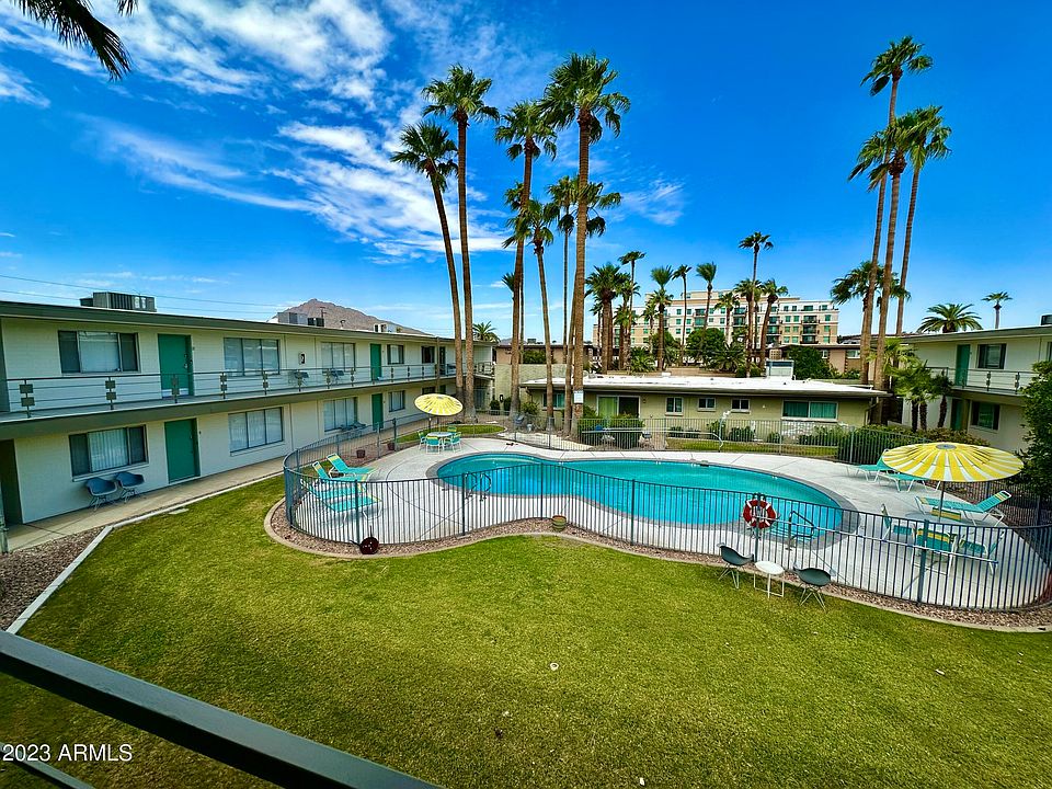 Best location and views in this community! Here's your opportunity to own a successful seasonal turn-key rental property that is walking distance to Old Town Scottsdale. It's available fully furnished, features iconic mid-century modern interior design, and has views of Camelback Mountain from the living area. The HOA covers all utilities including electricity. A new A/C system was installed in 2022 and a shower renovation was recently completed in September of 2023. The entire Grenada community was repainted in the Fall of 2023 and is one of the most vibrant iconic resort-style condo complexes in the Garden District!