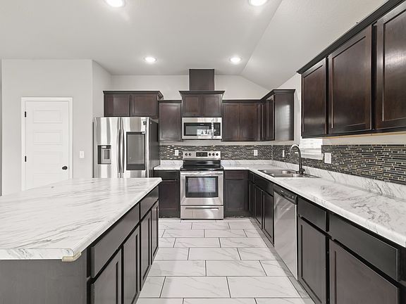 This 4 bed, 2 bath home features a split floor plan with a spacious open living, dining, and kitchen area. The kitchen includes a large island, upgraded lighting, oil-rubbed bronze faucet, and craftsman-style cabinets. The primary bedroom is oversized with lots of natural light. The attached bathroom has a walk-in closet, linen closet, water closet, and bronze fixtures. Enjoy the covered patio and bright, open living space..
