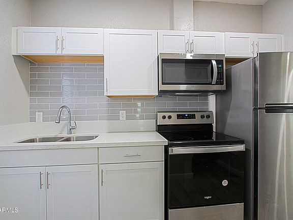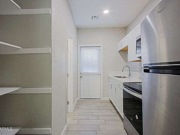 One Bedroom Villa at Washington Park offers wood tile flooring throughout, tall open ceilings, white shaker cabinets in the kitchen, galaxy quartz countertops, a glass decorative backsplash, a stainless sink, and newer appliances. The Primary bedroom is spacious and comes with new blinds. Fans in each room. The bathroom features a tub shower with a tile surround and shaker white cabinets, as well as a stackable washer and dryer. The villa boasts a large front porch patio for relaxation and enjoying the Arizona weather, a spacious front yard, and a private fenced backyard area. Enjoy your villa at Washington Park! Price includes Incentives! Hurry will not last.