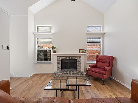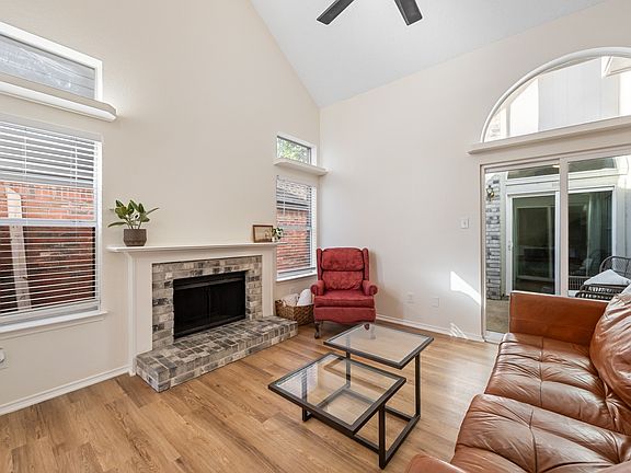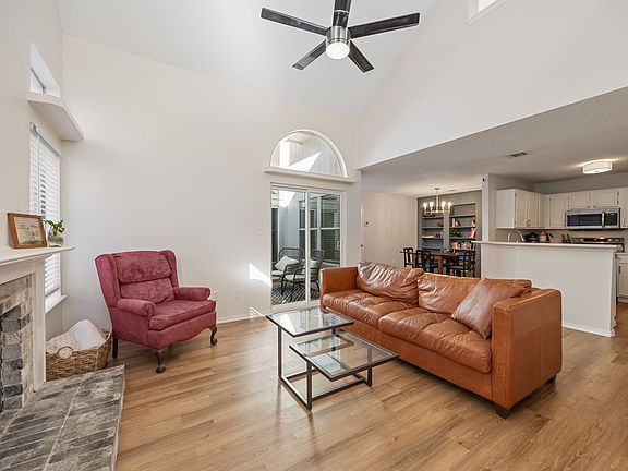 Welcome to this charming and warm home featuring vaulted ceilings and a beautiful open floor plan! As you step inside, you are greeted with a cozy fireplace at the heart of the home. The living space seamlessly flows into the bright kitchen and dining room surrounded by windows that fill the space with natural light. Step through the sliding glass doors to a lovely patio perfect for entertaining or relaxing outside. The primary bedroom on the first floor features beautiful tall ceilings, a sliding glass door to the outdoor oasis, and a fireplace. With the perfect blend of comfort and charm, this beautiful home is ready to welcome you in.