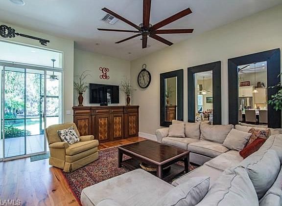 H.8787 - This gem deserves to be on your must-see list. Just 2 miles east of 951, upon 2.73 acres of beautifully manicured grounds, is this stunning estate offering you the privacy you desire blended with the quality & craftsmanship you expect. Within the 3-bedroom, 2-bath main house, gorgeous wood floors, soaring ceilings and designer touches, including ceiling fans and built-ins, define the varied living spaces from the great room to the den, while stainless appliances and gleaming granite add a touch of sparkle to the thoughtfully-designed kitchen. Just steps away from the screened lanai, which runs the length of the home, a 480 SF separate garage offers you additional space, while further back on the property a 1,650 SF workshop with four overhead doors caters to boating and/or RV enthusiasts. Conveniently, all of these CBS structures are linked via concrete drives and walkways. Refer to the attached Special Features to see all this home has to offer.