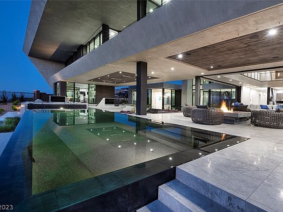 2 Infinity Pools, 1 Spa, Glass Wine Cellar, Indoor-Outdoor Office, Bar & Media Room, Billiard Game Room, Gym, Indoor-Outdoor Living Room and wine tasting lounge, Strip View Master with Spa Bath and His and Her Custom Closets, Wolf /Subzero Chef Kitchen, Catering Kitchen, Outdoor EVO/Hibachi Grill & Bar, Swim Up Outdoor BBQ Kitchen & Bar, 4 Fireplaces, Covered Outdoor Living Room between two pools with Ceiling Heaters & Misters, Automatic Pocket & Corner Doors. Elevator, Central Vac, Exquisite Quality and Finishes. Double Gated Dragon’s Reserve Location. 681 Dragon Peak Drive, Henderson, NV 89012 in Exclusive MacDonald Highlands. Modern. Luxury. Flawless.