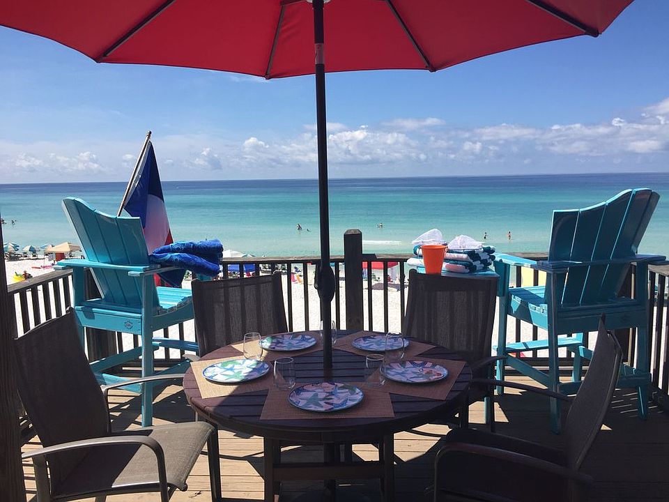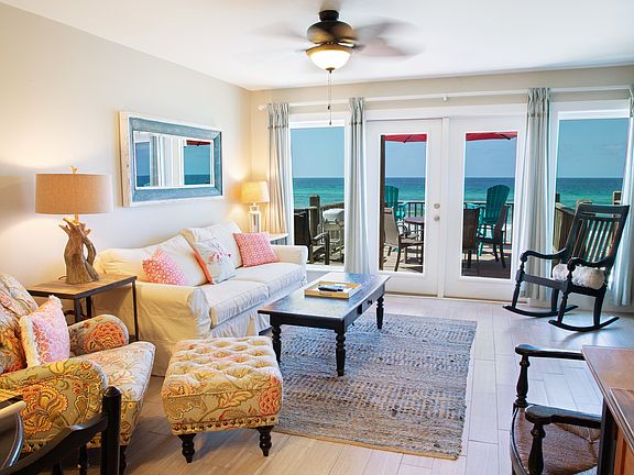 A gulf front in the gorgeous Eastern Lake area! Just kick off your shoes, walk out of your door, down your own steps, and hit that squeaky soft sugar-white sand that Seagrove is so famous for. The ground floor is for parking and storage, and has a small entry foyer to the unit. The living area, half bath, and kitchen are on the second floor with wonderful gulf vistas. The two bedrooms are on the third floor, with the master bedroom being gulf front. The second bedroom has a regular bed, and two bunks, too. There are two gulf front decks, and the master bedroom has a gulf front balcony. There are only four units in this building, which abuts Summer's Edge. The Ramsgate owners and guests have full use of both pools in Summer's Edge. You can see pictures at www.vrbo.com/412880.