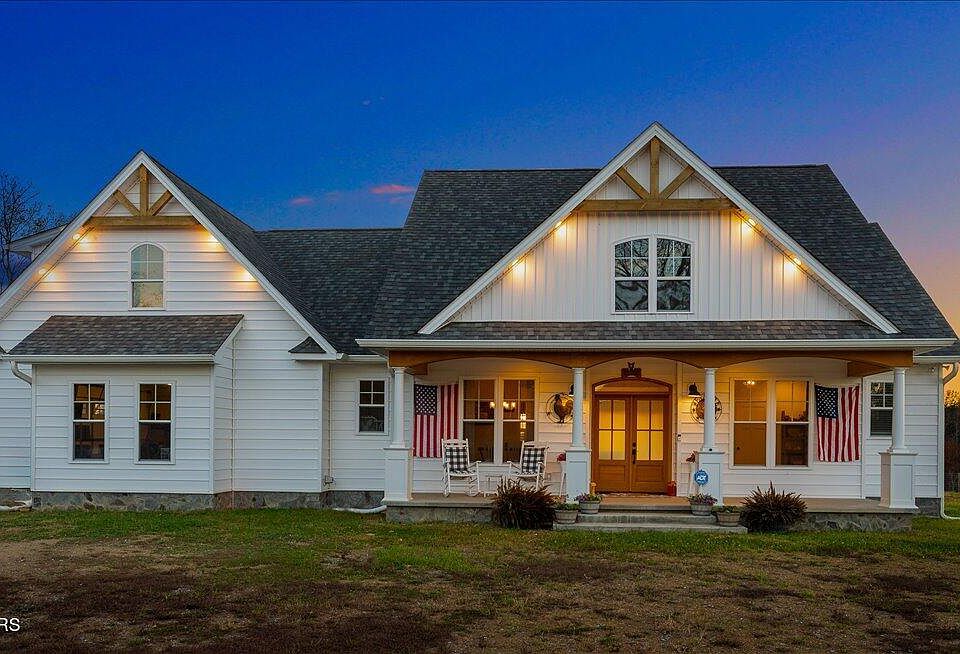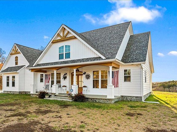 Built in 2023, this Greeneville home sits on 13.71 serene mostly fenced county acres and offers 3 bedrooms plus a spacious bonus room. The great room features impressive 16-foot ceilings, Andersen slider windows, abundant natural light throughout, and a ventless gas fireplace, while the primary suite adds 12-foot ceilings for an open, airy feel. The kitchen is well-appointed with a double oven and a reverse osmosis water system. Double-pane windows, ample attic storage, and public water at the home add everyday convenience. Upstairs is an extra large bonus room with a full bathroom and an abundance of storage space. On the main level, you have the convenience of a large garage with extra storage and a work space. Outside, enjoy two stocked ponds ideal for fishing—one equipped with a paddle boat—and beautiful sunset views across the property. The land also includes a chicken coop and 2 other barns for added versatility. The detached 2-car garage, with automatic garage doors, has its own electricity, public water, and cable hook up. Next to the detached garage, you will see the beautiful open lower pasture. This clearing is roughly an acre, has a septic in place, access to public and well water and a natural spring, and a livestock barn, perfect for caring for more livestock or building a second dwelling. You will be only 15 minutes from downtown Greeneville where you will find shopping, restaurants, and Greeneville Community Hospital. With close access to major highways, you are only 45 minutes from Johnson City and 1 hour from Knoxville. This property blends modern comfort with functional acreage to fit a variety of lifestyles.