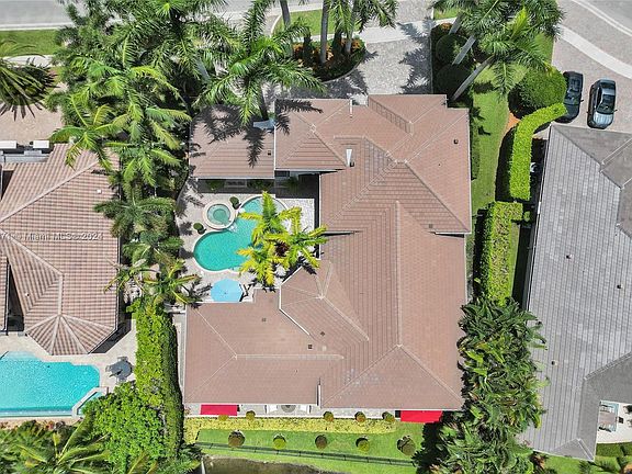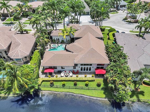 YOUR PRIVATE TROPICAL OASIS AWAITS YOU! Stunning 2 story house on a quiet cul-de-sac in the 24/7 guard gated Hawks Landing. It features 5 bed/4.5 bths w/ waterfront views. A New Roof, exterior paint 2023, all impact windows/doors in 2022. Smart Home, security cameras, security lights. The first floor has the sumptuous primary w/dbl W.I.C., marble spa bath. Wood floors & high volume ceilings make this a true retreat. Enjoy your large chef's kitchen with dbl. stacked wood & glass cabinets. High end appliances w/ 6 burner gas stove & dbl. ovens. New wine & beverage cooler makes for easy entertaining. marble & wood floors throughout. The separate guest house has views of the pool & spa plus amazing courtyard landscaping, W.I.C. and refreshment bar plus full bath. Look no further, you’re home.