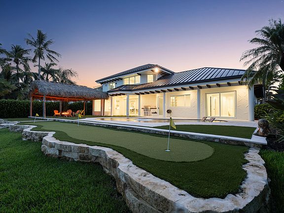 Located in the private, gated enclave of Bay Pointe, this reimagined waterfront estate offers 100' of wide river views, eastern exposure, and deep water dockage for a 95' yacht. Features include a new standing seam metal roof, PGT impact glass, marble and refinished wood flooring, and re-stuccoed exterior. The chef's kitchen has quartzite counters, custom cabinetry, Bertazzoni/Bosch appliances, Sub-Zero fridge, copper fixtures, and swing-out barstools. The primary suite offers dual walk-ins, spa bath with freestanding tub, walk-in shower, and private den with water views. Outside, enjoy a saltwater pool with marble pavers, in-pool stools, fountains, turf, putting green, and firepit. Dock includes synthetic decking, 24K/16K lifts, mooring whips, power/water pedestals