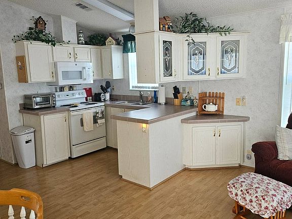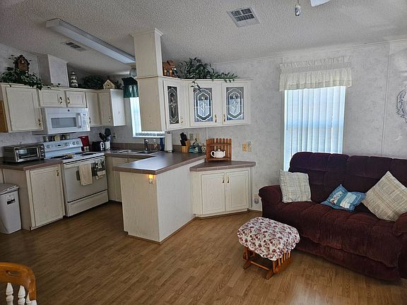 Welcome to your dream retreat! This 880 sq. ft., fully furnished home is situated on a spacious corner lot in a vibrant 55+ resort community. Featuring a new roof (2023) and a new AC unit (2019), this home is move-in ready and designed for comfort. Inside, you'll find beautiful laminate flooring throughout, complemented by new vinyl plank flooring in the enclosed lanai-a perfect space to relax or entertain. The open layout offers a seamless flow from room to room, and the bright and airy design creates a welcoming atmosphere. The property includes a double carport for ample parking and a golf cart to explore the community in style. Enjoy resort-style amenities and a vibrant social calendar that comes with living in this desirable community. Don't miss this incredible opportunity to own a well-maintained home with modern upgrades in an active and friendly neighborhood. Schedule your tour today!