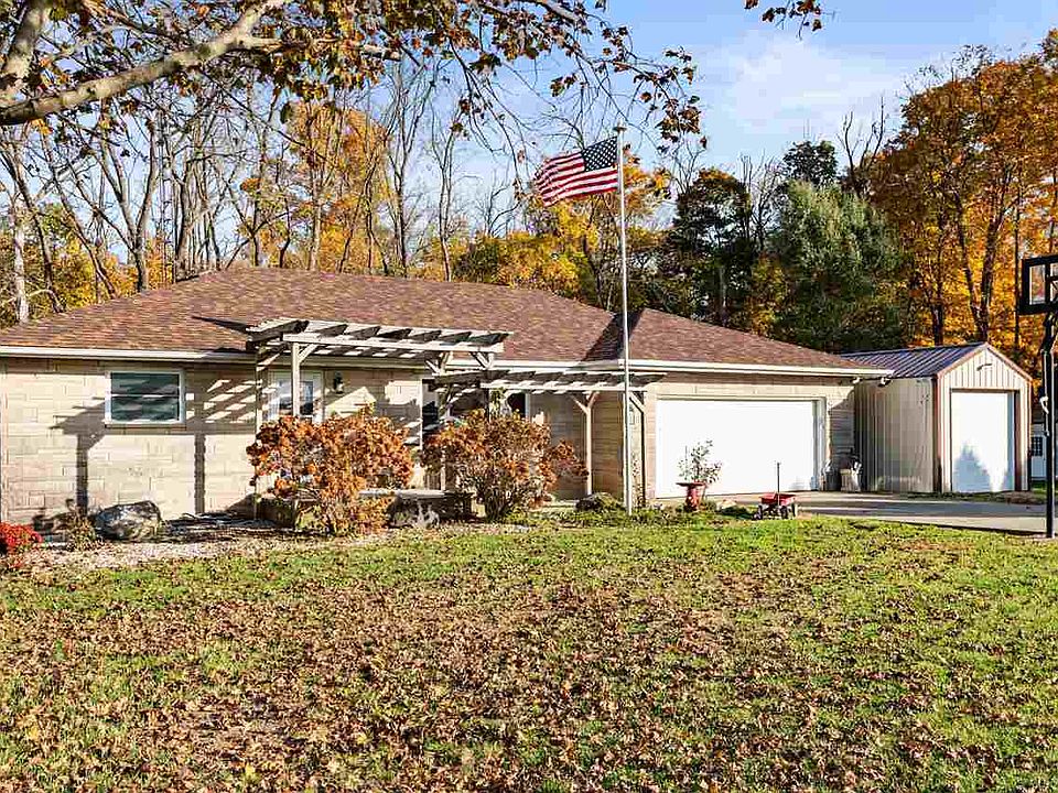 This charming 1,610 SF home has plenty of curb appeal with its stone exterior, spacious yard, and wooden arbor. Open living space, bright kitchen, updated bathrooms, and hardwood floors all add to the character of this home. The master bedroom features an ensuite complete with large walk-in closet. The second bedroom is spacious and features access to a full bath located in the hall. The At .75 acres, the property has lovely landscaping with a fire pit and mature surrounding trees. The full basement provides an exceptional amount of storage space. Property also includes a 2 car attached garage, new 23' x 12' detached garage, and a 19' x 11' shed with concrete floor and power.