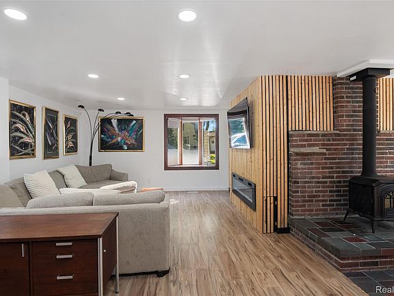 In-wall fireplaceExpansive backyardFresh paintPaved patioWalk-in closetWhite countertopsCharming wood stove